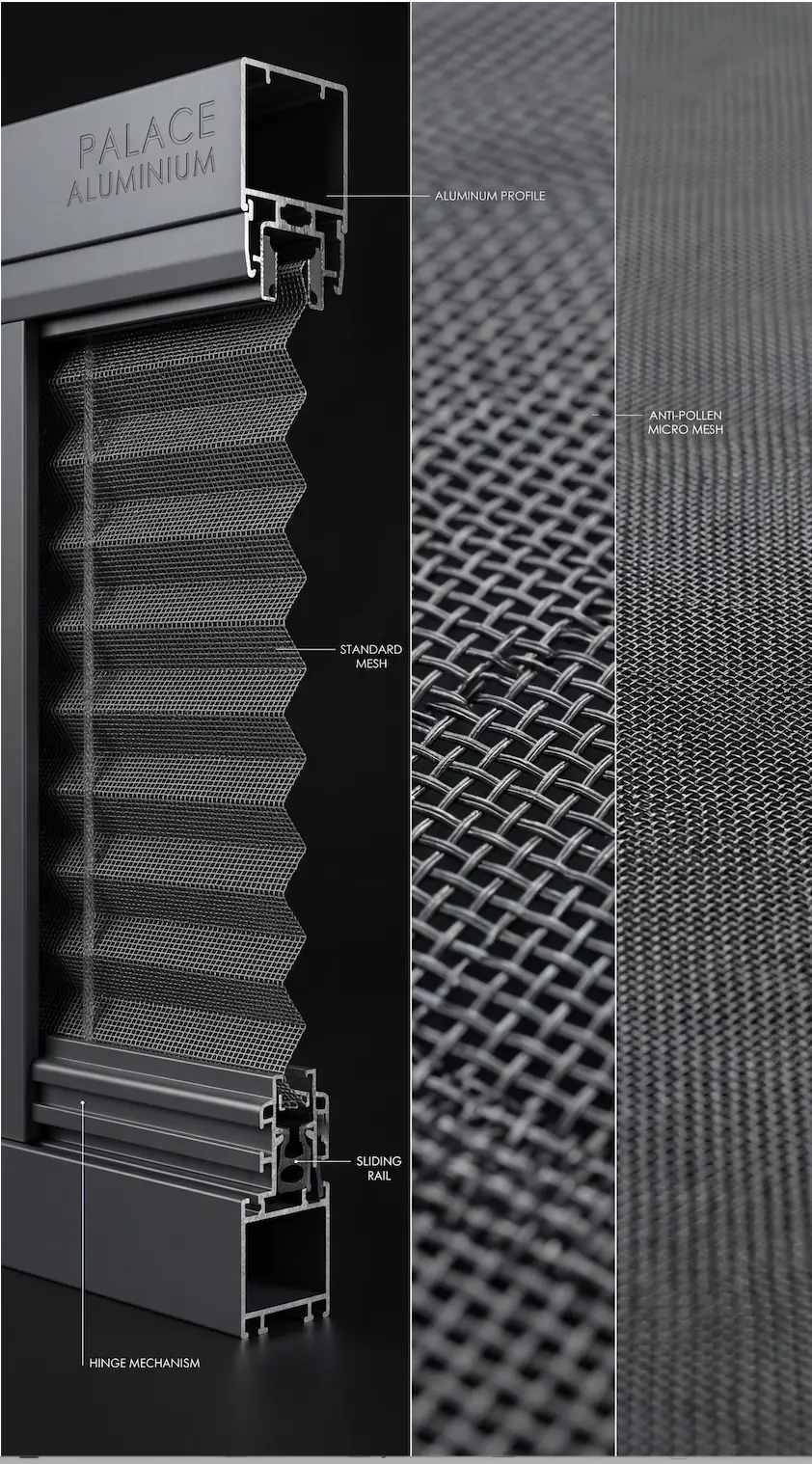 Novalux Akordeon Plise Sineklik, minimal tasarım ve üstün mekanik hassasiyetle pencere uygulamaları için özel üretilmiştir. İnce kasa profili, yüksek yoğunluklu sineklik tülü ve premium alüminyum kaplamasıyla hem estetik hem fonksiyonel bir çözüm sunar.